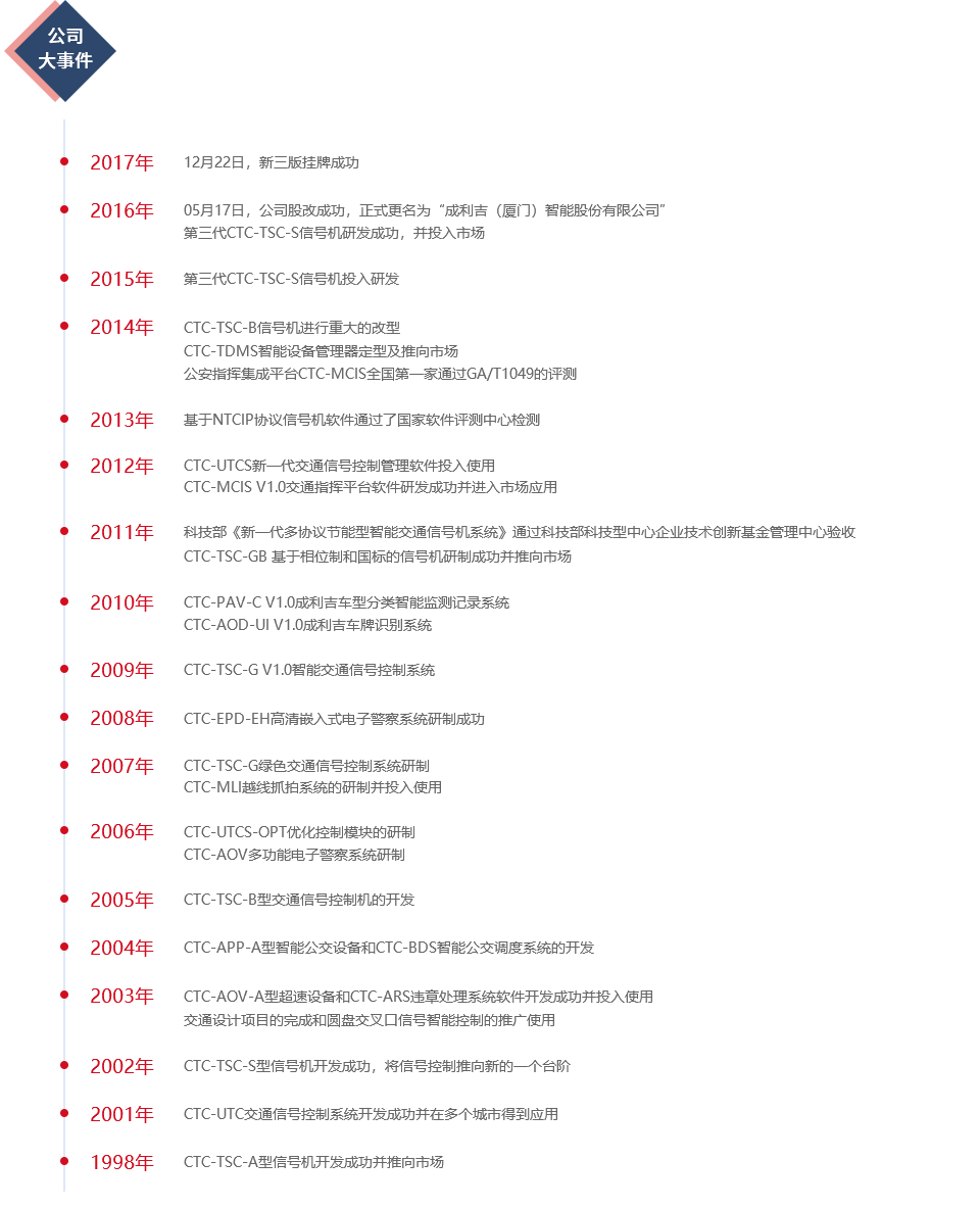 成利吉(廈門)智能股份有限公司,成立于1998年,是國內(nèi)最早從事智能交通領(lǐng)域產(chǎn)品研發(fā)和應(yīng)用、專業(yè)智能交通核心軟件開發(fā)、智能交通系統(tǒng)集成與運(yùn)營(yíng)服務(wù)的企業(yè)之一。公司于2016年5月正式更名為成利吉(廈門)智能股份有限公司,并于2017年12月22日新三版成功掛牌。